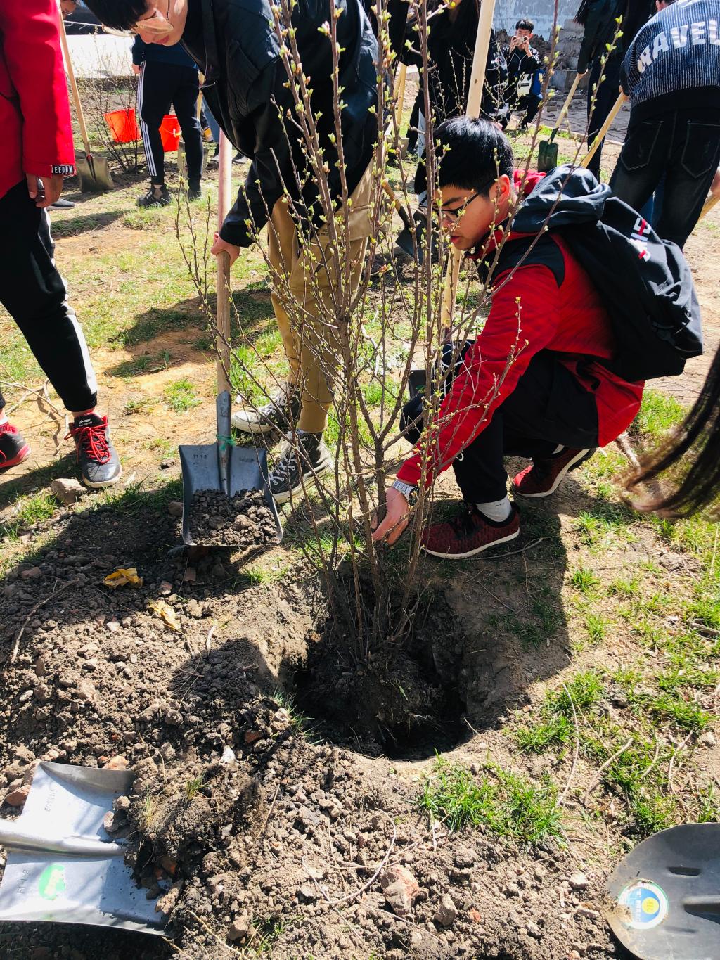 植树现场,负责人先为同学们讲解植树的注意事项,发放树苗和铁锹等工具后,同学们分工明确、齐心协力,“撸起袖子加油干”开始了热情洋溢的植树活动。每一个树坑的挖成,每一颗树苗的栽下,都象征着一份绿色的希望;每一滴汗水的流下,每一铲泥土的填充,都代表着一份奉献与责任。众人拾柴火焰高,众人植树树成林,看着不在光秃的土地,同学们发自肺腑的笑了。