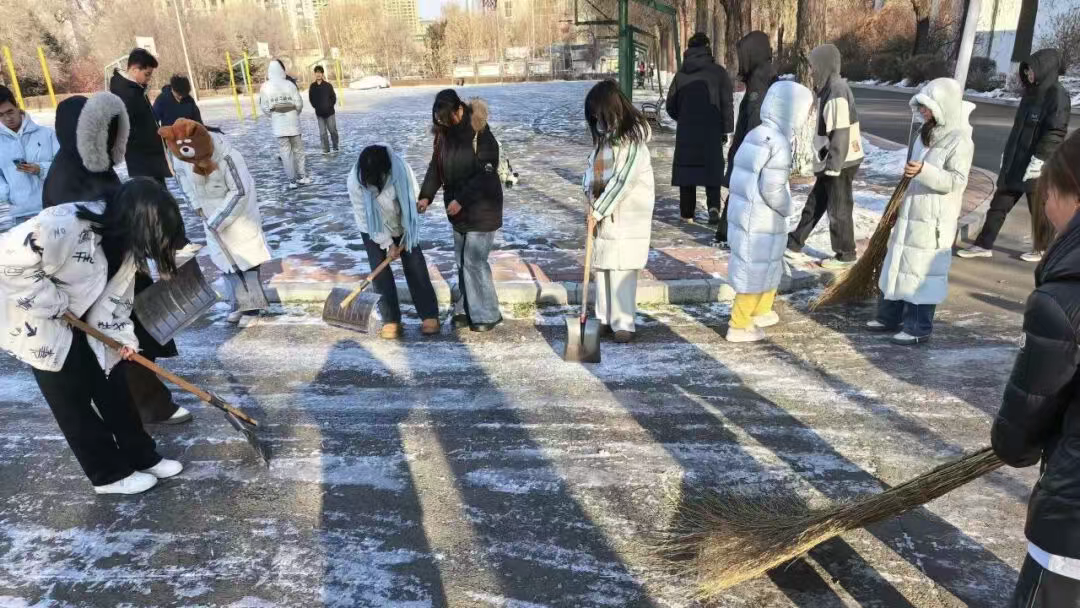 同学们不畏严寒、分工协作,手持扫帚、铁锹等工具,对校园主干道、宿舍门前等关键区域的积雪与薄冰进行集中清理。有些同学俯身挥锹,奋力铲除路面厚实的积雪与暗冰;有些同学手持扫帚,来回清扫残留的浮雪,不留一处死角。经过数小时的奋战,校园重点区域的积雪冰块被清理干净,露出其本来的面貌,助力师生出行安全与便捷。