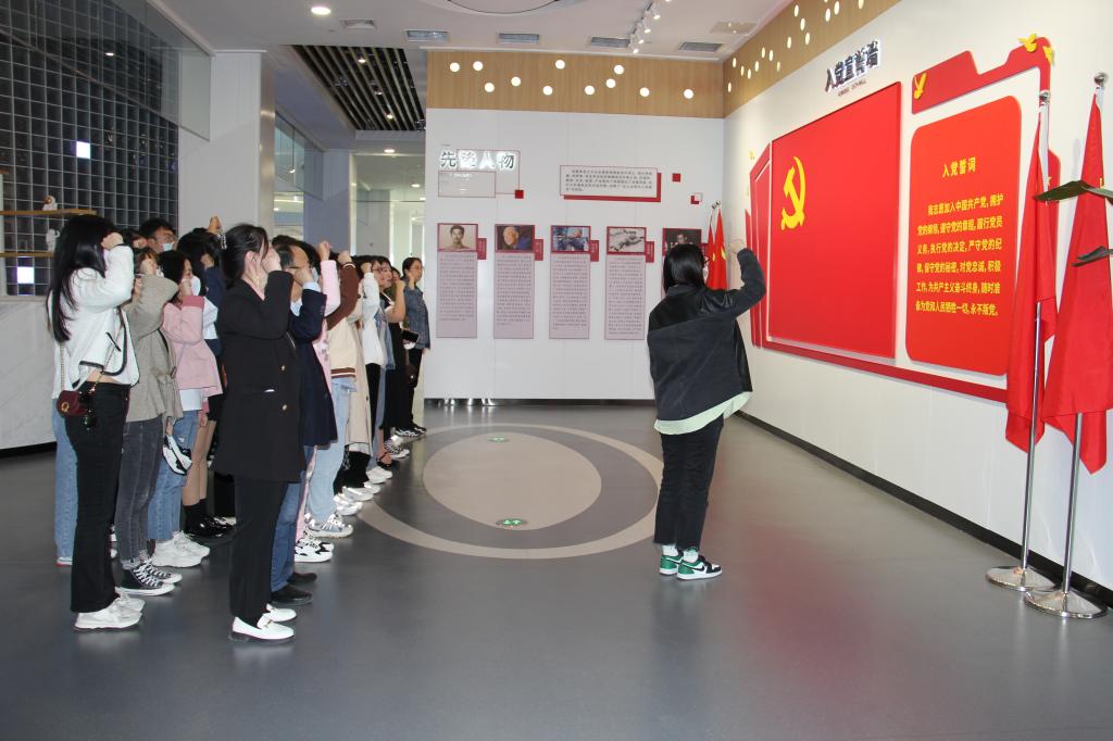 参观学习过程中,参加活动的支部党员在党旗下重温入党誓词,进一步增强党支部的凝聚力及战斗力,强化党员的责任感、使命感,坚定学生党员毕业后扎根龙江、服务龙江、创业龙江的信心。