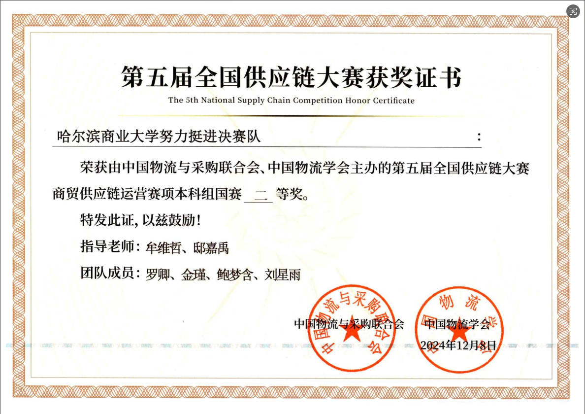 2024年12月7日-8日,第五届全国供应链大赛商贸供应链运营赛项全国总决赛圆满落幕。由我院2023级物流管理专业罗卿、金瑾、鲍梦含、刘星雨四位同学组成的“努力挺进决赛队”在牟维哲、邸嘉禹两位老师指导下,获得全国总决赛二等奖的好成绩!我校也成为全国10家最佳组织奖获得单位之一!