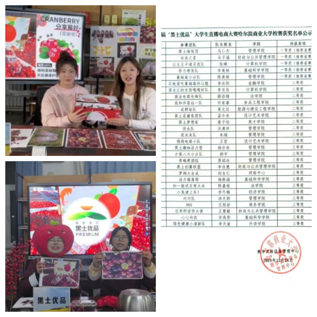 在省赛阶段,2支晋级队伍紧扣“讲好黑土故事、助力乡村振兴”主线,以专业素养、数字素养赋能农产品推广。经过激烈角逐,由王海滨、邸嘉禹两位教师指导的“蔓越莓小分队”(成员:陈美琪、吴书瑄、周林、李俊臻、樊娜),聚焦龙江特色浆果产业,将蔓越莓的营养价值与黑土地生态文化紧密结合,以“小浆果讲述大故事”,荣获省级三等奖。