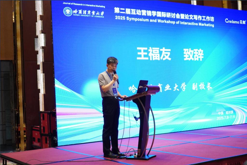 首先,由哈尔滨商业大学副校长王福友致辞,王福友在致辞中对参会嘉宾表示热烈欢迎,介绍了哈尔滨商业大学基本情况,强调了本次会议对推动互动营销学领域学术研究和实践发展的积极意义,并预祝大会圆满成功。