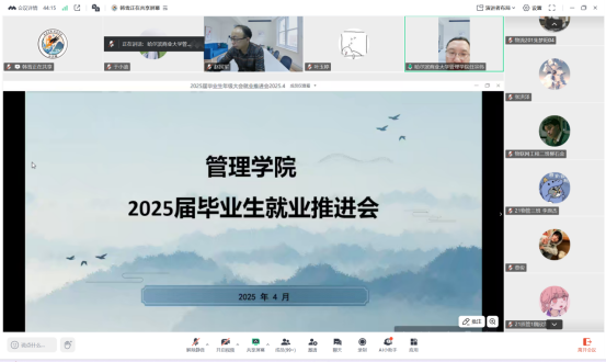 为应对当前复杂就业形势和学院目前就业现状,扎实推进就业工作,管理学院于2025年4月2日线上召开2025届毕业生就业推进会。学院党委书记赵国军、院长任宗伟、副书记曹桂彬、各教研室主任、就业包保教师、毕业班辅导员以及全体2025届毕业生参加了此次会议。会议中,书记、院长、副书记、各教研室主任和辅导员分别进行了发言讲话。