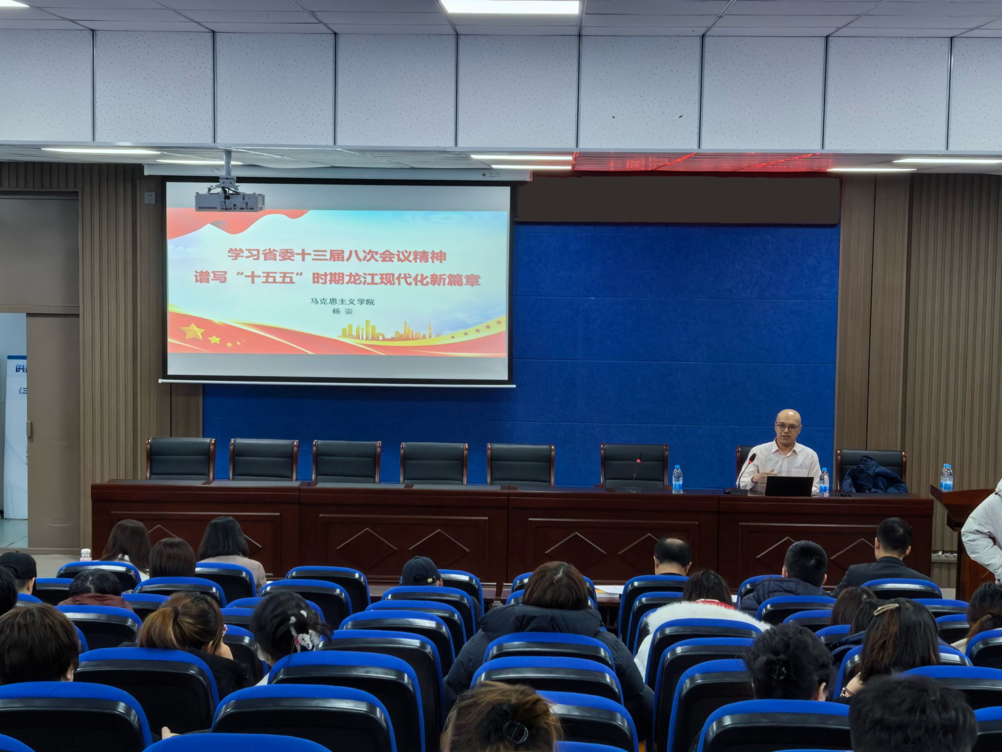 杨崇老师以省委十三届八次会议精神谱写“十五五”时期龙江现代化新篇章为题,深入分析“十五五”时期龙江现代化强省建设的基础条件,系统阐释“十五五”时期高质量振兴发展的总体要求,详细阐述“十五五”规划的十二项重点任务部署,为教工、学生党员深入理解省委决策部署、把握龙江发展大势提供了重要指导。